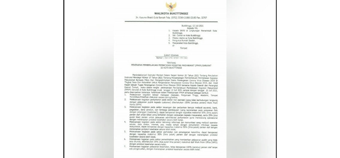 BUKITTINGGI, METRO–Dalam rangka pelaksanaan Pemberlakuan Pembatasan Kegiatan Masyarakat (PPKM) Darurat di Kota Bukittinggi diberlakukan, 12 -20 Juli 2021. Walikota Bukittinggi mengeluarkan Surat Edaran (SE) No.360/244/BPBD-VII/ 2021 tentang Penerapan Pemberlakukan Pembatasan Kegiatan Masyarakat (PPKM) Darurat di Kota Bukittinggi, 12 Juli 2021. Dalam SE yang ditujukan kepada Kepala SKPD di Lingkungan Pemko Bukittinggi, Camat se Kota Bukittinggi, Pelaku Usaha se Kota Bukittinggi, Pengurus Rumah Ibadah dan Masyarakat Kota Bukittinggi itu.