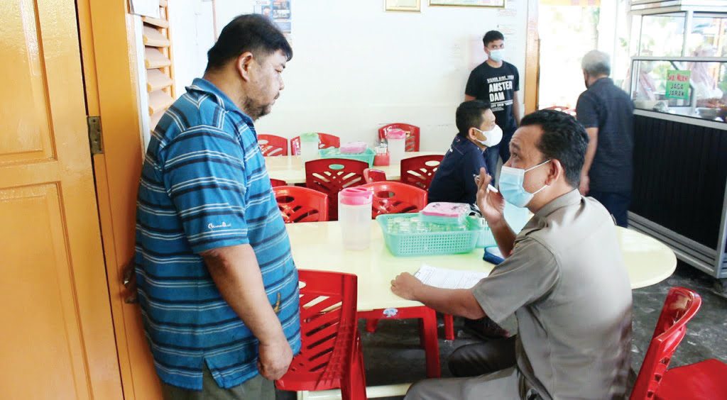 TAN MALAKA, METRO–Satuan Polisi Pamong Praja Kota Padang memberikan surat pangilan kepada salah satu pemilik usaha rumah makan di Jalan Dobi, Kecamatan Padang Barat, Rabu (14/7). Hal tersebut dilakukan petugas karena rumah makan ini melanggar tentang Pemberlakukan Pembatasan Kegiatan Masyarakat (PPKM) di Kota Padang.