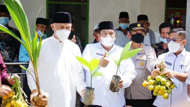 PDG.PARIAMAN, METRO–Gubernur Sumatra Barat H Mahyeldi Ansharullah didampingi Bupati Padangpariaman Suhatri Bur, kemarin, serahkan bantuan bibit kelapa dan pinang wangi. “Bantuan kita berikan untuk peningkatkan ekonomi masyarakat,” kata Bupati Padangpariaman Suhatri Bur saat serahkan bantuan di Nagari Sikucua Utara Kecamatan V Koto Kampung Dalam, Kabupaten Padangpariaman.