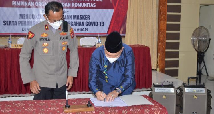 AGAM, METRO–Wakil Bupati Agam, Irwan Fikri menghadiri penandatanganan pakta integritas, dalam mendukung pemakaian masker serta penanganan dan pencegahan Covid-19 di wilayah hukum Polres Agam di Aula Wibisono, Polres Agam, Jumat (16/7).