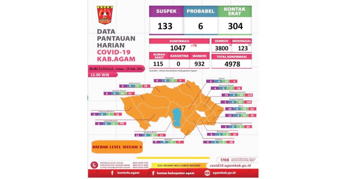 AGAM, METRO–Kasus penyebaran Covid-19 di Kabupaten Agam hampir menyentuh angka 5.000 kasus. Sebanyak 1.047 di antaranya merupakan kasus aktif. Plt Kepala Dinas Kesehatan Kabupaten Agam, Drs Yosefriawan menyebutkan, kasus terkonfirmasi Covid-19 Senin Kemaren (19/7) ini bertambah sebanyak 78 kasus.