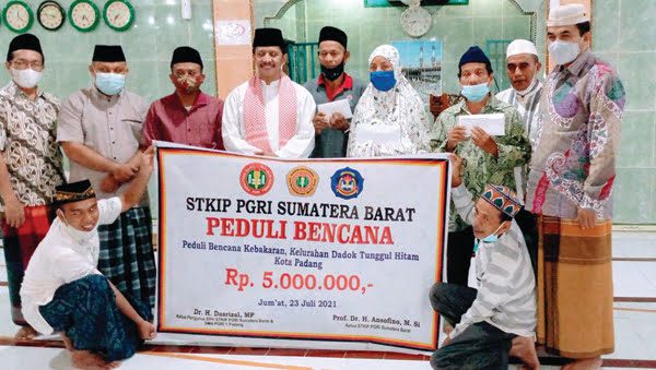 “Begitu pulalah STKIP-PGRI Sumbar ini yang peka terhadap masyarakat, khususnya masyarakat yang berada di sekitar lingkungan. Untuk itu saya diberikan amanah oleh pengurus STKIP-PGRI Sumbar menyalurkan bantuan itu. Kebetulah para korban ini adalah jamaah Masjid Darul Muttaqin, Dadok Tunggul Hitam,” sebut Dasrizal.