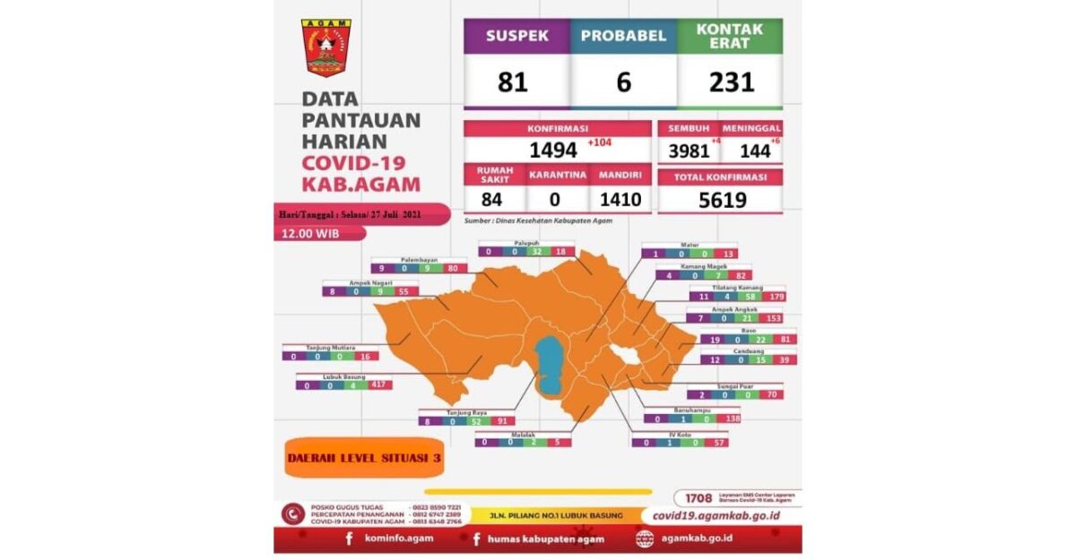 Kabupaten Agam kembali menambah 104 kasus baru warga positif Covid-19, Selasa (22/7). Tambahan ini menjadikan total kumulatif warga Agam terkonfirmasi virus tersebut menyentuh angka 5.619 orang. Hal itu disampaikan Plt Kadis Kesehatan Agam Yosefriawan. 104 kasus baru itu katanya tersebar di empat belas kecamatan.