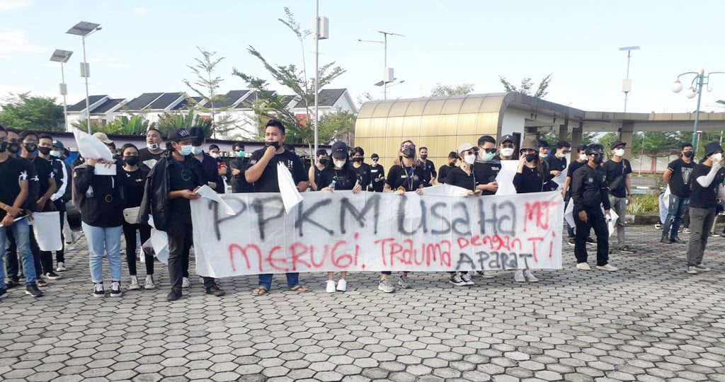Massa datang dan ber­kum­pul usai pelaksanaan iba­dah shalat Ashar de­ngan membawa spanduk berbagai tulisan seperti “Tolak PPKM”, “PPKM usa­ha mati, merugi, trauma dengan aparat, “kami ingin berjualan setiap hari tanpa dirazia”, dan lainnya.