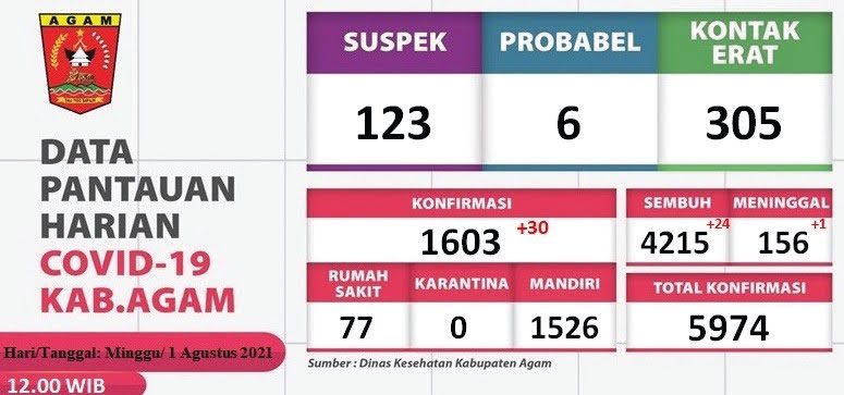 “Hari ini, kami terima laporan tambahan warga sembuh dari Covid-19 sebanyak 24 orang. Sehingga sejauh ini total kesembuhan Covid-19 di Agam terhitung sebanyak 4.215 kasus,” kata Plt Kepala Dinas Kesehatan Kabupaten Agam, Yosefriawan, kemarin.