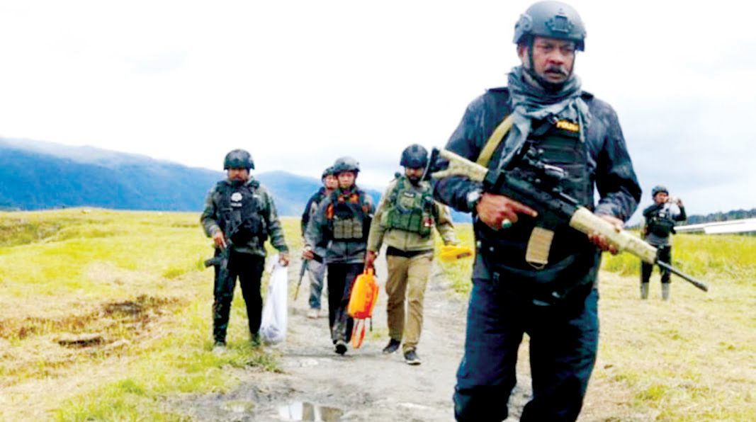 PENGEJARAN— Aparat gabungan TNI-Polri saat melakukan pengejaran terhadap KKB di sekitar Bandara Aminggaru, Ilaga, Kabupaten Puncak.