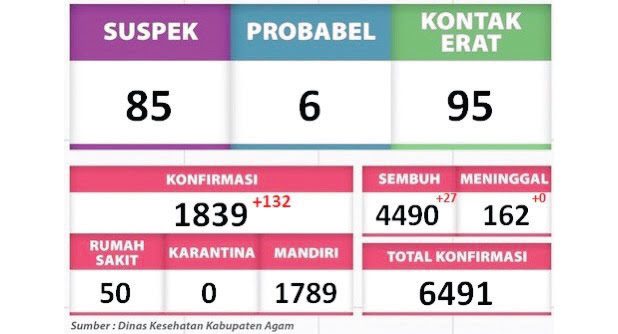 Asisten II Setkab Agam Yosefriawan mengatakan, dengan penambahan itu menjadikan jumlah kasus terkonfirmasi di Agam kini mencapai 6.491 sejak kasus pertama diumumkan awal Mei 2020. “Kami laporkan, hari ini ada penambahan 132 kasus positif baru dari 13 kecamatan,” kata Yosefriawan, Koordinator Bidang Data dan Sosialisasi Satgas Penanganan Covid19 Agam itu lagi.