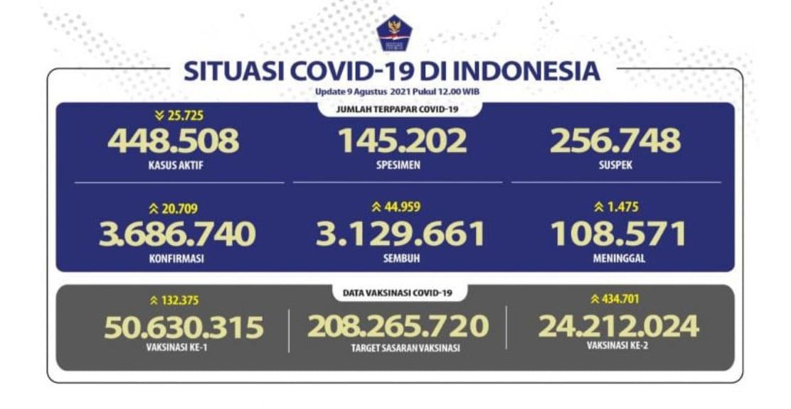 JAKARTA, METRO–Kasus Covid-19 harian mengalami penurunan yaitu ada 20.709 kasus pada Senin (9/8). Namun turunnya kasus disebabkan tes yang anjlok. Hari ini lebih rendah dari kemarin yakni 145.202 ribu spesimen saja. Lebih rendah dari kemarin, Minggu (8/8) yakni 166.764. Kini total 3.686.740 orang terinfeksi Covid-19.