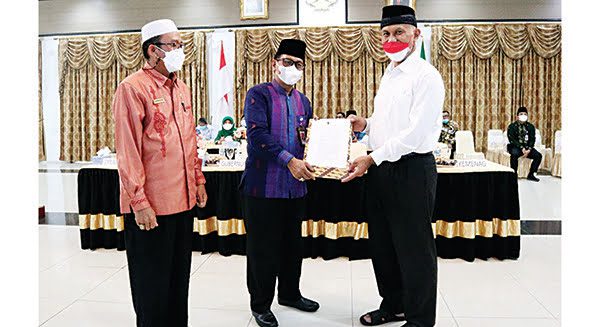 Kanwil Kemenag Sumbar diwakili H Yufrizal SAg M HI menyerahkan Surat Keputusan (SK) Bank Nagari sebagai LKS-PWU kepada Gubernur Sumbar Mahyeldi Ansharullah selaku pemegang saham pengendali, selanjutnya SK diserahkan gubernur kepada Direktur Utama Bank Nagari Muhammad Irsyad.