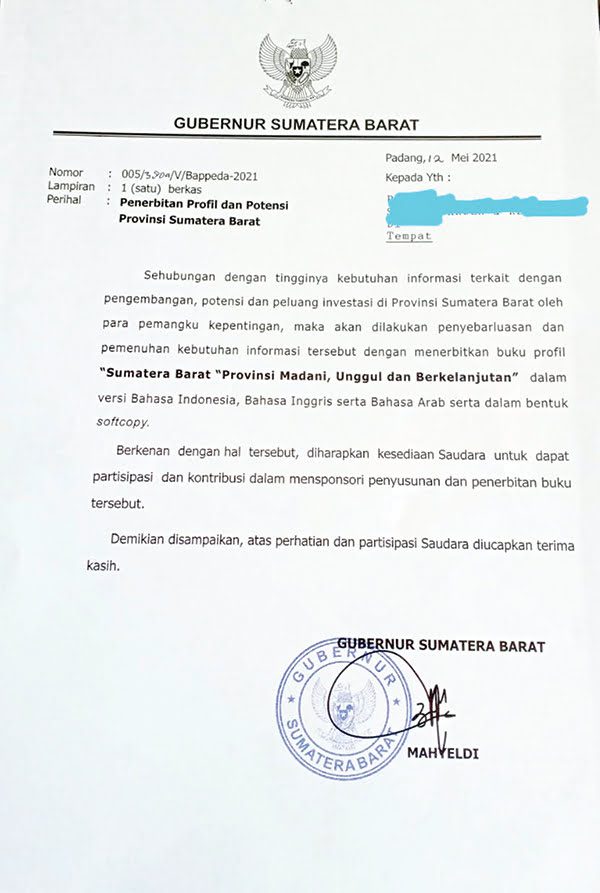 “Kalau betul suratnya, salah juga pemerintah provinsi kenapa orang sipil yang disuruh minta uang mengunakan kop surat ditanda tangani gubernur. Makanya, kita Pihak mencoba berkoordinasi dengan Bappeda Sumbar. Akan tetapi, instansi ini belum bisa memberikan keterangan karena beralasan rapat,” ujarnya.