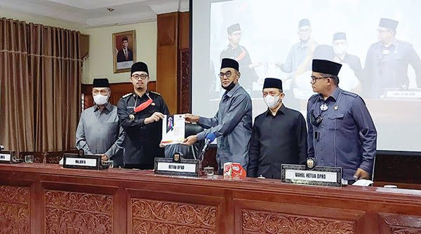 serahkan RANCANGAN—Wali Kota Bukittinggi Erman Safar menyerahkan Rancangan R-KUPA PPAS APBD 2021 kepada pimpina dewan.