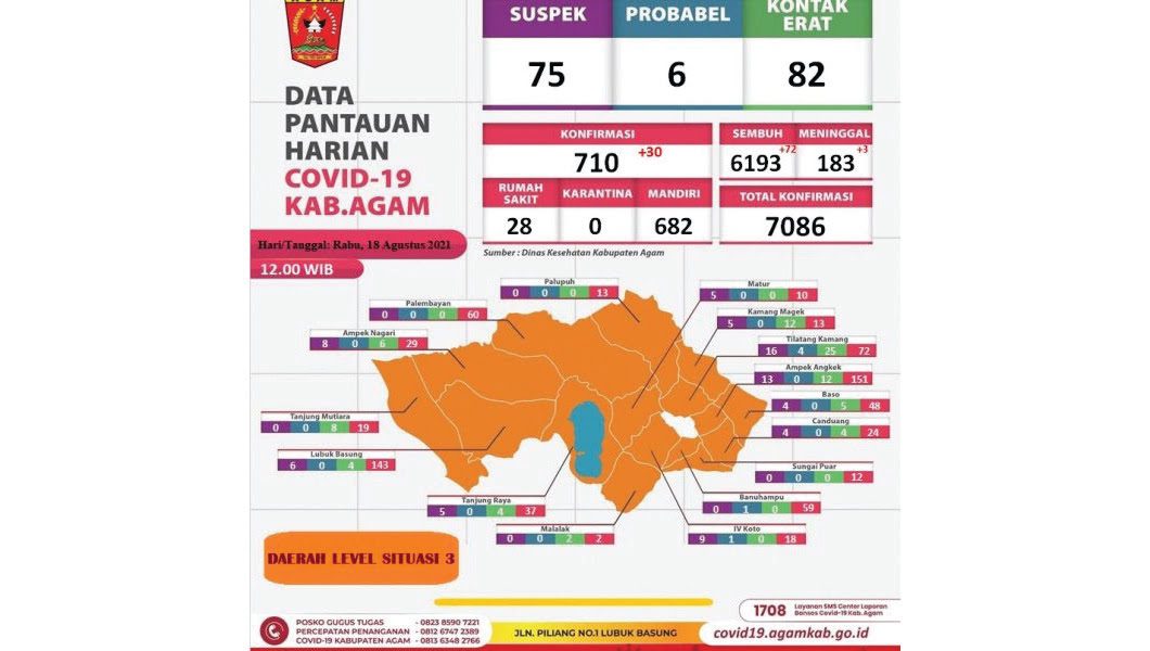 AGAM, METRO–Jumlah kasus positif Covid-19 di Kabupaten A­gam terus memper­lihat­kan tren penurunan dalam lima hari belakangan. Ter­baru dilaporkan angkanya kembali berkurang 72 ka­sus, Rabu (18/8).