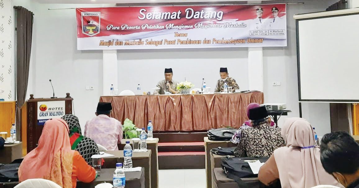 BUKITTINGGI, METRO–Wakil Walikota Bukittinggi Marfendi memberikan materi pada Pelatihan Manajemen Masjid dan Mushalla di Aula Hotel Grand Malindo Bukittinggi, Kamis (19/8). Pelatihan itu berlangsung selama tiga hari, sejak Rabu hingga Jumat (18-20 Agustus 2021).