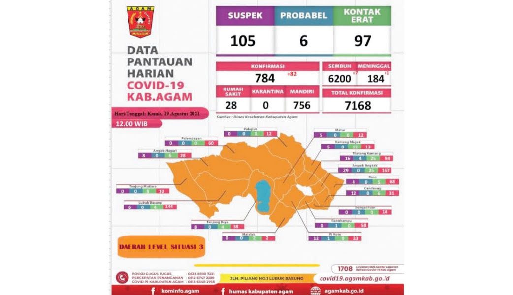 Informasi tersebut disampaikan Kepala Dinas Kesehatan Kabupaten Agam, dr Hendri Rusdian. Dikatakan pasien terkonfirmasi Covid-19 hari ini tersebar di dua belas kecamatan. “Dilaporkan Agam kembali menambah sebanyak 82 kasus terkonfirmasi Covid-19, sehingga total keseluruhan kasus terkonfirmasi menjadi 7.168 orang,” ujar dr Hendri.