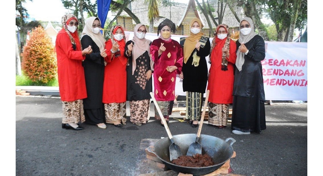 TANAHDATAR, METRO–Mendukung dan mensukseskan pendaftaran makanan terlezat di dunia Rendang sebagai Warisan Budaya Indonesia ke UNESCO, Dekranasda Kabu­paten Tanah Datar bersama sejumlah Organisasi Perangkat Daerah meningikuti gerakan bersama masak rendang serentak secara virtual di seluruh dunia, Sabtu (21/8) yang dilaksanakan di halaman Gedung Indojolito Batusangkar.