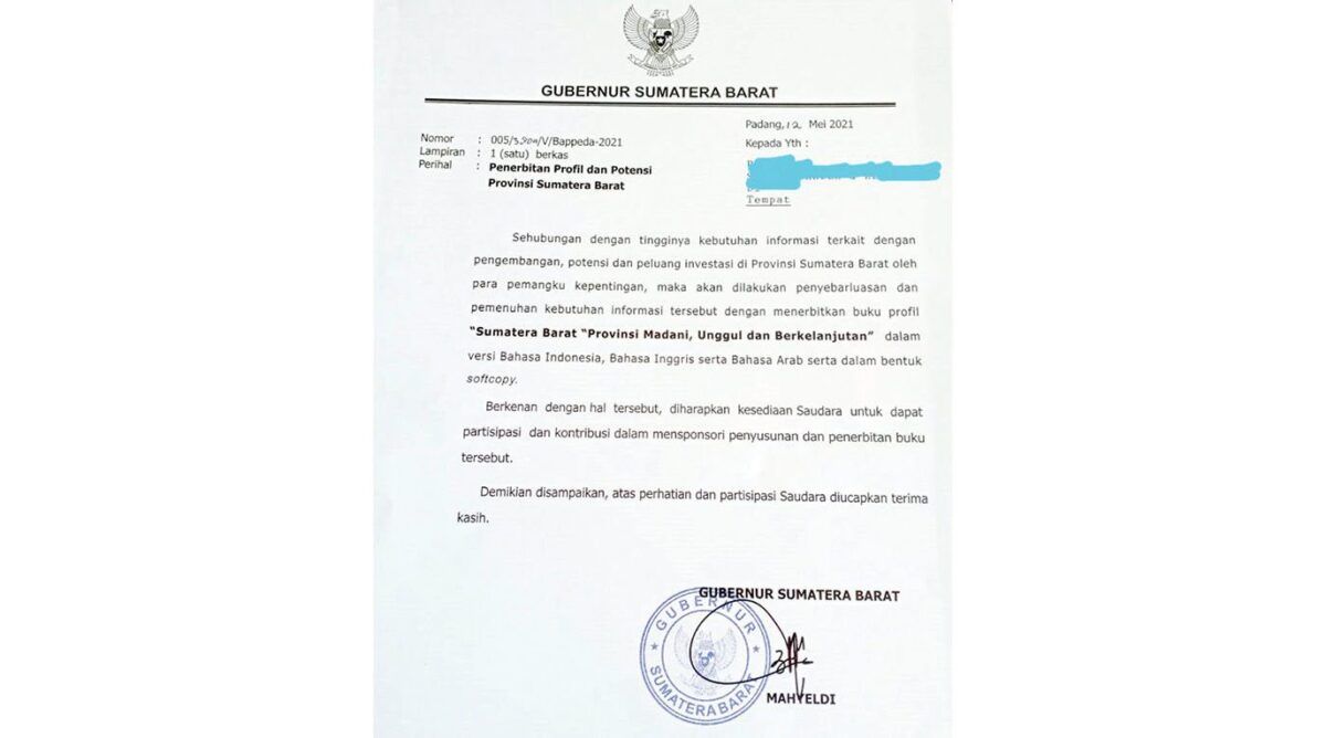Seperti diketahui, surat tertanggal 12 Mei 2021 bernomor 005/3904/V/Bap­peda-2021 tersebut perihal penerbitan profil dan po­tensi Provinsi Sumatra Ba­rat. Kop surat ditan­da­tangani Mahyeldi An­sha­rullah.