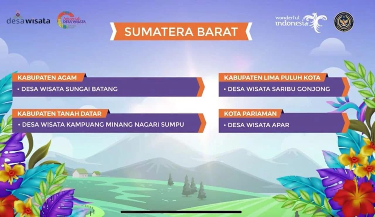 Di Provinsi Sumbar katanya lagi, ada empat desa yang lolos ke babak 50 besar. Selain Nagari Sungai Batang di Agam, ada Desa Wisata Kam­pung Minang Nagari Sum­pu, Tanahdatar. Desa Wi­sata Seribu Gonjong, Lima­puluh Kota dan Desa Apar, Kota Pariaman. “Alham­dulillah, Sungai Batang lolos hingga ke tahap no­minasi 50 besar Anugerah Desa Wisata Indonesia,” ujar Syatria.