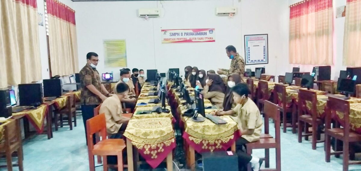 SUDIRMAN, METRO–SMP Negeri 8 Payakumbuh saat ini tengah melaksanakan simulasi pelaksanaan Asesmen Nasional Berbasis Komputer (ANBK) yang rencananya bakal digelar pada bulan Oktober mendatang. Kepala Sekolah SMP Negeri 8 Payakumbuh H. Hendri mengatakan pelaksanaan simulasi ANBK bagi siswa SMPN 8 Payakumbuh tersebut dilakukan per sif. Yang mana satu sif itu terdiri dari 15 orang Peserta, dalam simulasi ini melaksanakan Prokes Covid 19 yaitu memakai masker,cuci tangan dan jaga jarak
