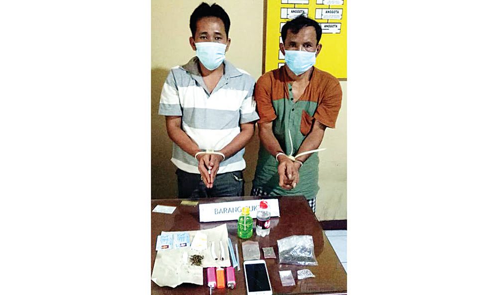 Dalam penggerebekan itu, Polisi menangkap dua orang berinisial MF (54) dan PP (32) yang Saat dilakukan penggeledahan, Polisi menemukan barang bukti berupa satu paket sabu ukuran sedang, sabu paket sabu ukuran kecil, dua paket ganja kering, dua lenting ganja kering dan dua set bong.