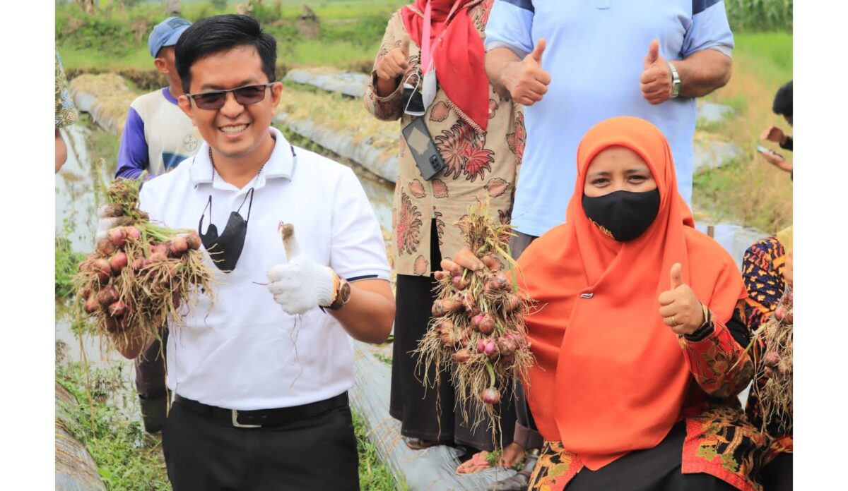 PAYOLINYAM, METRO–Wakil Wali Kota Erwin Yunaz, memanen bawang bersama Kelompok Tani Kosiak, di Lingkungan Payolinyam, Kelurahan Tigo Koto Dibaruah, Kecamatan Payakumbuh Utara, Kamis (2/8). Turut hadir Camat Desfitawarni, Kabid PTH Dinas Pertanian Rozi Alleni, Lurah Dian Fitria, petugas BPSB dari Provinsi Sumbar Oktaviandra, Koordinator DPP Yuliza, Penyuluh Eni Kurniati, serta KJF Dinas Pertanian Sesderfi dan Ketua Kelompok Tani Kosiak Bustanul Arifin (Itok) didampingi Ketua Subhortikultura Hengki.