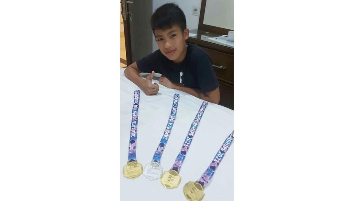 SUDIRMAN, METRO–Fathi Arrasyid, siswa SD IT Al Huffazh berhasil meraih ttiga medali emas dan satu medali perak pada ajang Jakarta Open New Conseps Championship 2021 yang digelar panitia pelaksana pada tanggal 1 sampai 3 September 2021 di Stadion Aquatic Gedung Olahraga Bung Karno (GBK) Jakarta.