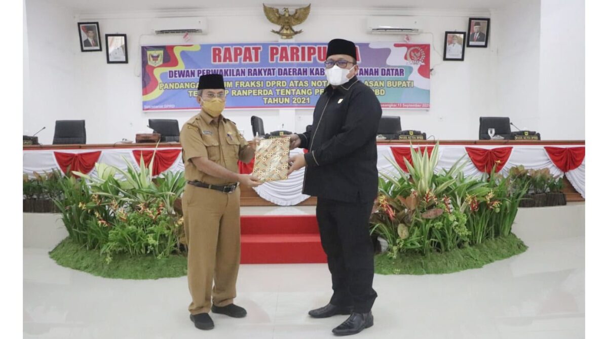 TANAHDATAR, METRO–DPRD Tanahdatar gelar rapat paripurna dengan agenda pandangan fraksi terhadap atas nota keuangan pengantar rancangan peraturan daerah (RANPERDA) tentang perubahan anggaran pendapatan dan belanja daerah Kabupaten Tanahdatar tahun anggaran 2021.