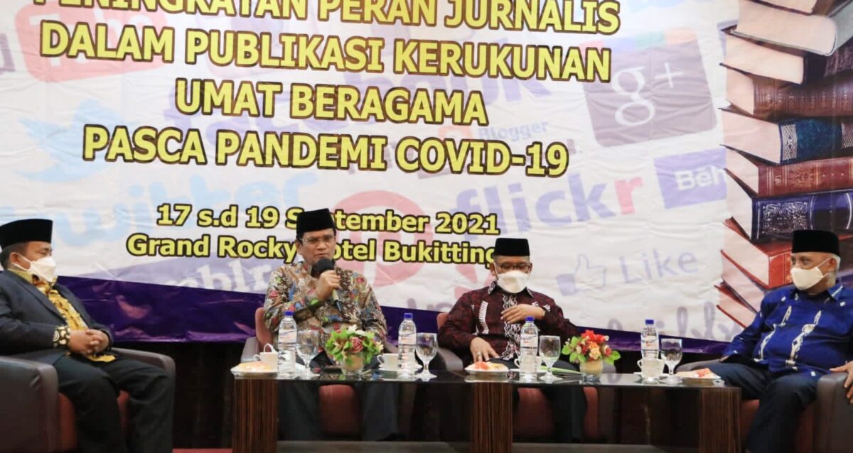 BUKITTINGGI,METRO–Pusat Kerukunan Umat Beragama (PKUB) Kemenag RI menggelar Kegiatan Peningkatan Peranan Jurnalis dalam Publikasi Kerukunan Umat Beragama Pasca Pandemi Covid -19 di Grand Rocky Hotel Bukittinggi, Jumat malam (17/9).