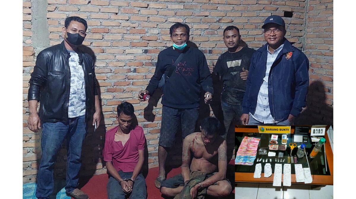 PENGEDAR DITANGKAP— Dua pengedar berinisial RJ (22) dan HA (37) ditangkap jajaran Satresnarkoba di Kecamatan Talamau, Minggu malam (19/9).