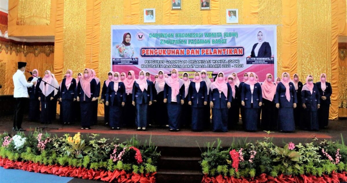 PASBAR,METRO–Sebanyak 43 Pengurus Gabungan Organisasi Wanita (GOW) Kabupaten Pasaman Barat (Pasbar), masa bhakti 2021-2025 resmi dikukuhkan dan dilantik oleh Wakil Bupati Pasbar H.Risnawanto didampingi Penasehat GOW Kabupaten Pasbar Ny. Titi Hamsuardi, kemarin. di Aula kantor bupati setempat. Pengukuhan dan pelantikan dihadiri oleh Bupati Pasbar sekaligus pelindung GOW Hamsuardi, Ketua GOW Kabupaten Pasbar Ny. Fitri Risnawanto beserta pengurus, Ketua Organisasi Wanita Kabupaten Pasbar, bundo kandung dan stakeholder terkait lainnya.