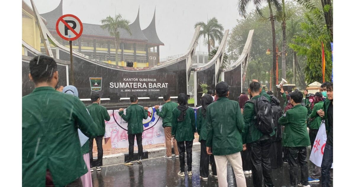 Meski diguyur hujan deras, mahasiswa itu tetap semangat menyampaikan orasi yang meminta kejelasan terkait penanganan kasus surat bertanda tangan Gubernur Sumbar, Mahyeldi yang dipakai untuk meminta sumbangan pembuatan buku kepada sejumlah pihak.