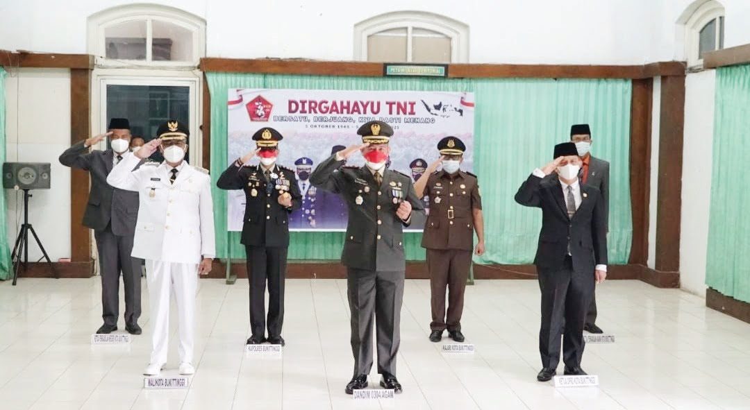 BUKITTINGGI, METRO–Pemerintah kota bersama seluruh Forkopimda Kota Bukittinggi, ikuti upacara peringatan HUT  TNI ke 76. Dandim 0304 Agam, bersama Wakil Wali Kota, Kapolres, Kajari, Wakil Ketua DPRD, Ketua Pe­ngadilan Negeri, Ketua Pengadilan Agama, mengikuti upacara secara virtual, di Aula Kodim 0304 Agam, Selasa (5/10).