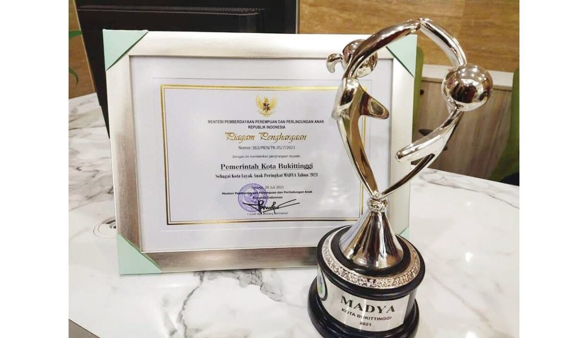 BUKITTINGGI, METRO–Kota Bukittinggi, kembali berhasil meraih penghargaan Kota Layak Anak tahun 2021, kategori madya. Penghargaan ini diterima Wali Kota yang diwakili Kabid P2KPA DP3APPKB Bukittinggi, di Jakarta, Rabu (13/10).