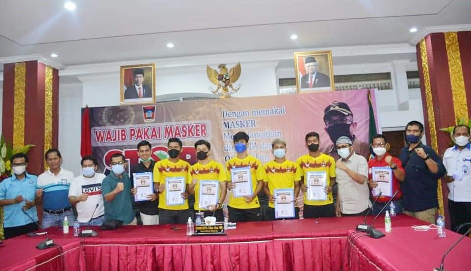 Pelatih kepala PSP Padang Delvi Adri beserta jajaran pelatih dan perwakilan pemain turut hadir dan menandatangani kontrak musim kompetisi Liga 3 2021. (ren/rel)