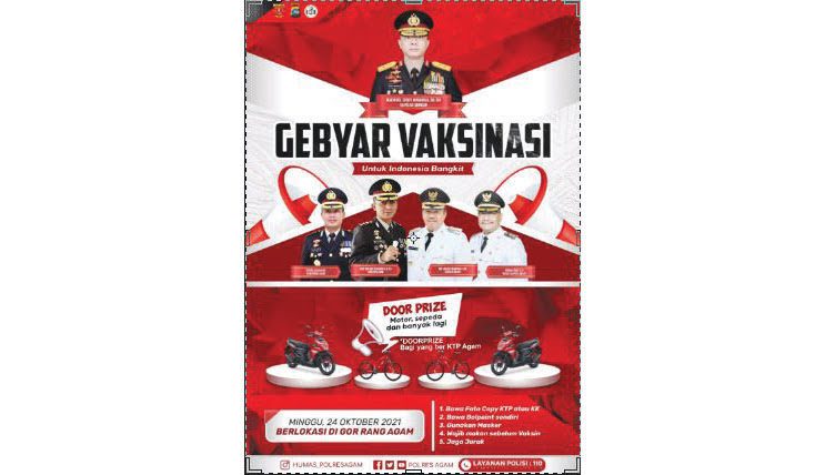 Minggu (24/10), jajaran Polres Agam bakal menggelar Gebyar Vak­sinasi secara gra­tis di GOR Rang Agam Pa­dang Baru Lubuk Basung.