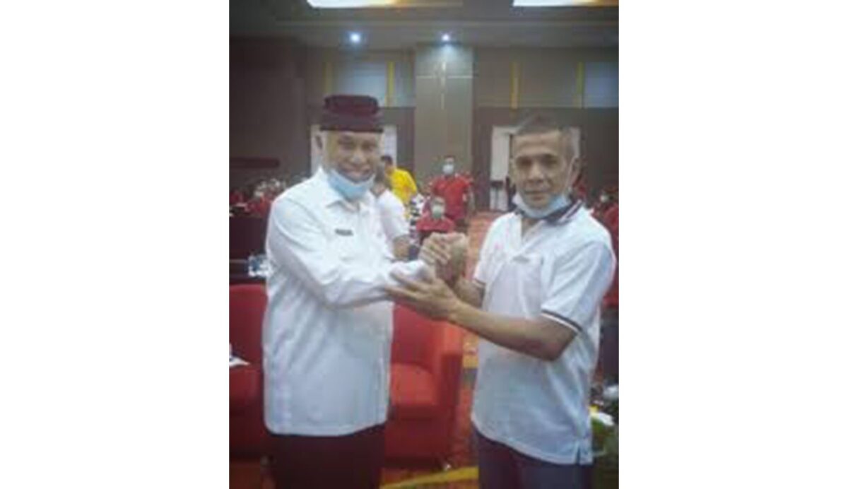 BERSAMA—Ketua KLONI Sumbar Agus Suardi bersama Gubernur Sumbar ketika Musorproblub KONI Sumbar Mei 2021.