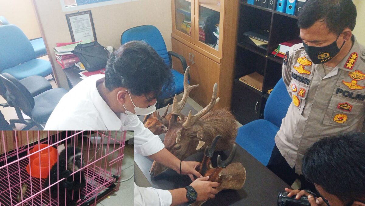Dijelaskan Kombes Pol Satake Bayu, hasil penangkapan pelaku, juga diamankan barang bukti berupa seekor owa ungko dalam kondisi hidup, dua kepala kijang dan satu kepala rusa yang telah diawetakan.