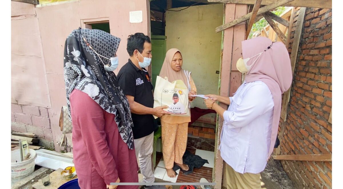 SERAHKAN BANTUAN— Pengurus Gerindra Sumbar menyerahkan bantuan uang tunai dan sembako dari Andre Rosiade untuk keluarga Lindrawati dan Feri Fadillah di Dadok Tunggul Hitam, Kototangah.