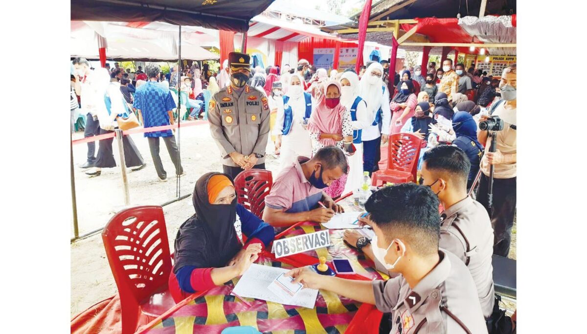 KOTOTANGAH, METRO–Ikut peduli membantu program pemerintah daerah menyukseskan Sumbar Sadar Vaksin (Sumdarsin), Sabtu (13/11), Kapolsek Koto Tangah, AKP Afrino bekerjasama dengan Ikatan Wanita Pengusaha Indonesia (IWAPI), berhasil melakukan vaskin sebanyak 1.878 warga dari jumlah yang hadir sebanyak 1.917 orang warga. Kegiatan akbar ini dihadiri langsung Kapolresta Padang Kombes Pol Imran Amir.