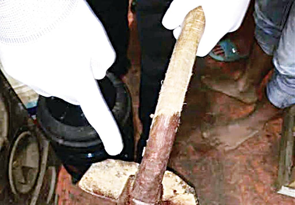 CANGKUL— Polisi memperlihatkan cangkul yang digunakan anak membunuh ibu kandungnya.