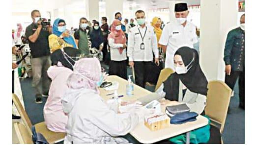 TINJAU VAKSINASI— Gubernur Sumbar, Mahyeldi Ansharullah saat meninjau pelaksanaan vaksinasi di Poltekes Kemen-terian Kesehatan di Padang, beberapa waktu lalu.