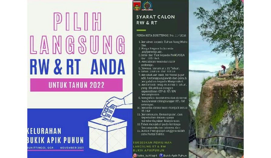Lurah Bukik Apik Puhun (BAP), Taufik Adi Putra, kegiatan pemilihan Ketua RT dan RW se Kelurahan Bukik Apik Puhun, akan dilaksanakan di akhir November mendatang. Proses pemilihan ini, dilaksanakan layaknya pilkada dan pileg, sebagai salah satu langkah juga untuk pendidikan pemilih. Hal ini menjadi salah satu ide pihak kelurahan bekerjasa sama dengan Ketua LPm, Hendra Eka Putra, ST Rangkayo Mulia.