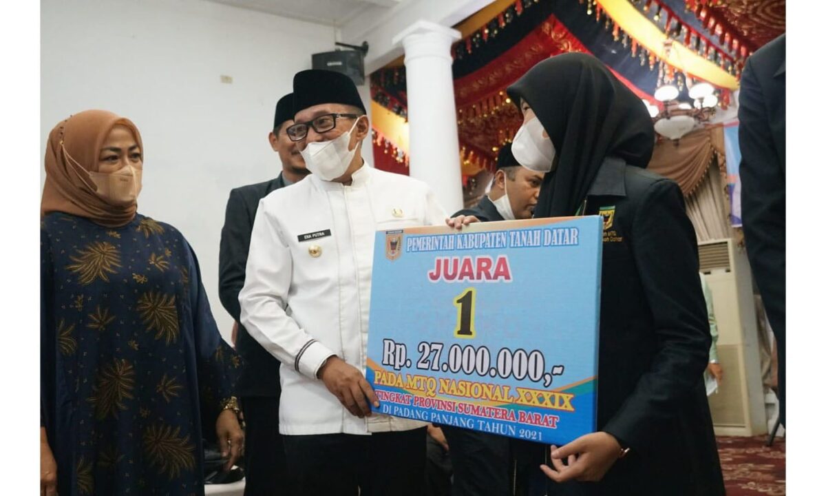 SERAHKAN BONUS— Bupati Tanahdatar Eka Putra serahkan bonus kepada kafilah atas keberhasilan yang diraih di MTQ Sumbar di Padangpanjang.