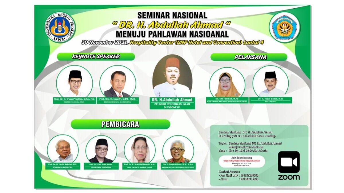 PADANG, METRO–Fakultas Ilmu Sosial (FIS) Universitas Negeri Padang (UNP) bekerjasama dengan PB PGAI Pa­dang gelar Seminar Nasional Dr. H. Abdullah Ahmad “ Menuju Pahlawan Nasional” ysng digelar di Hospital .City kampus UNP pada, Selasa (30/11).