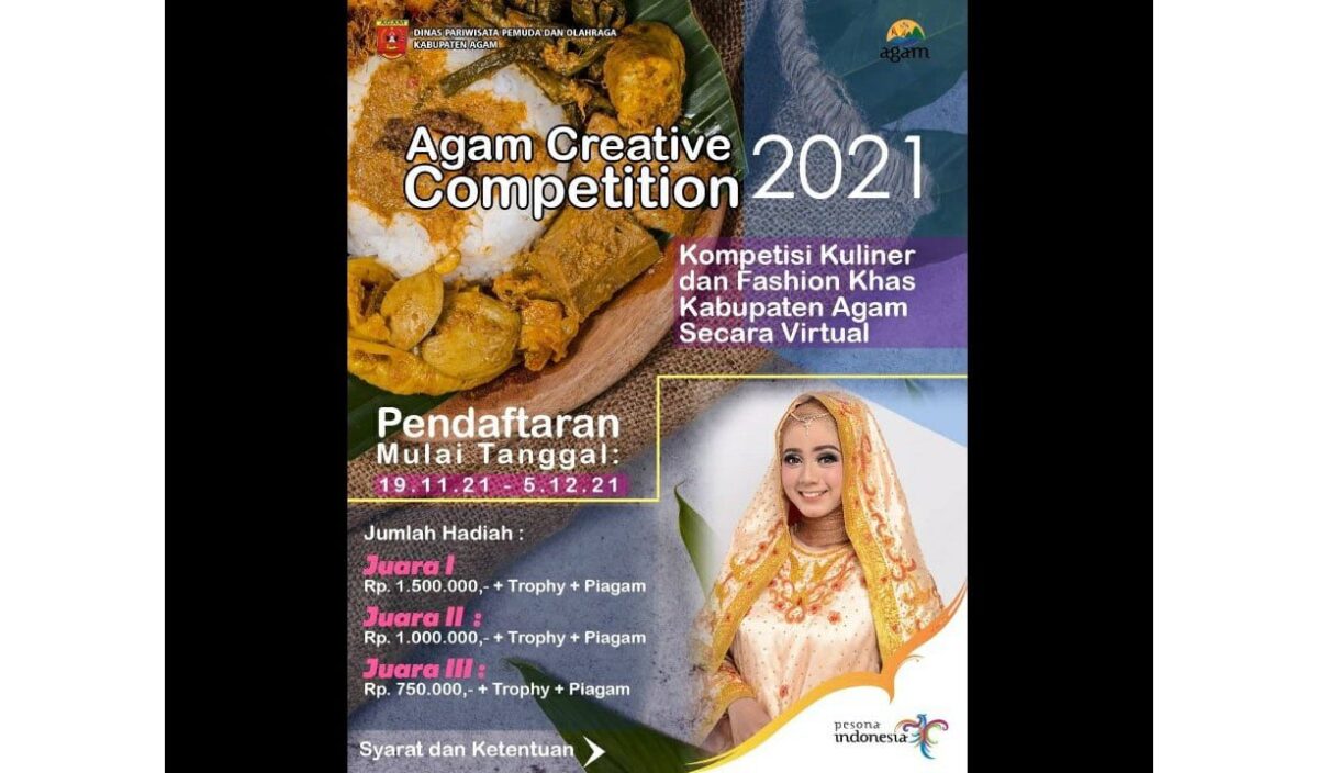 AGAM, METRO–Dinas Pariwisata Pemuda dan Olahraga (Disparpora) secara resmi mengumumkan pemenang Agam Creative Competition (ACC) 2021, Sabtu (11/12). ACC digelar dengan memperlombakan dua kategori yaitu kuliner dan fashion dari setiap kecamatan dan pemenangnya diumumkan melalui akun Instagram @agampesonaberagam.