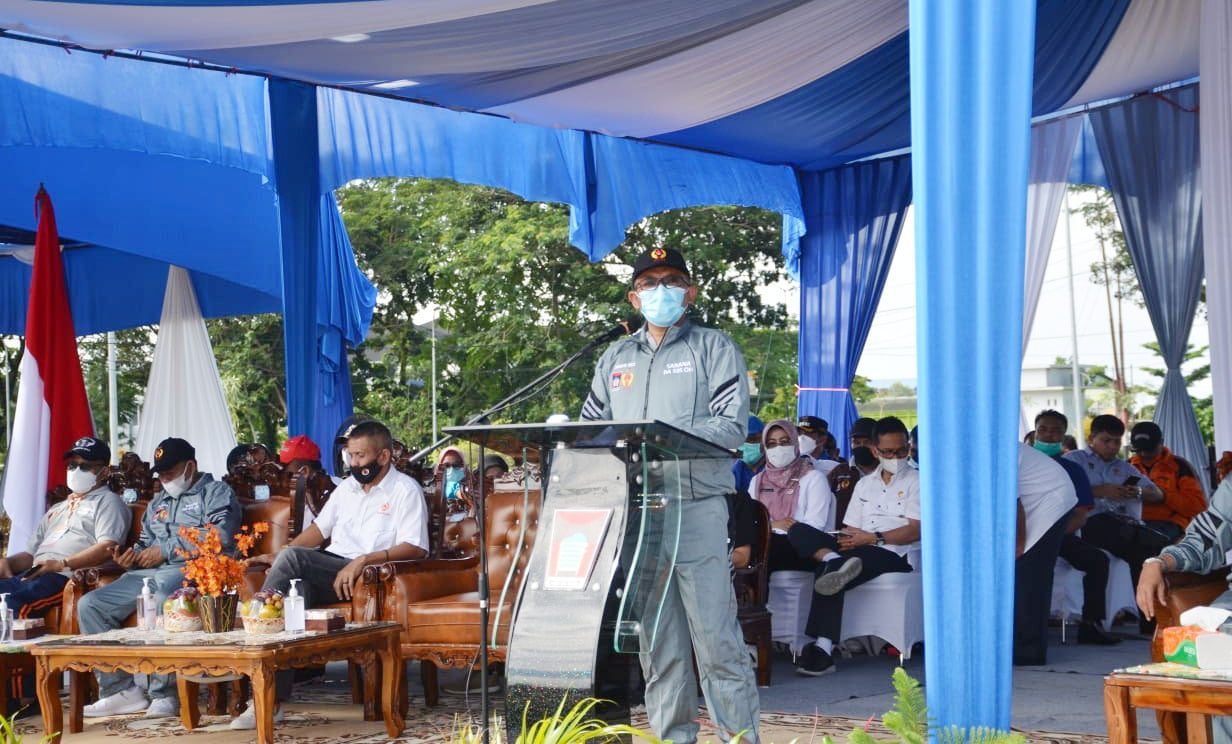 TABUH PORKOTA—Wali Kota Padang Hendri Septa beri kata sambutan saat membuka Porkota Padang 2021 di Balai Kota, Aie Pacah.