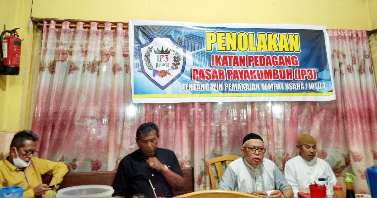 SUDIRMAN, METRO–Ikatan Pedagang Pa­sar Payakumbuh (IP3) menolak dengan tegas edaran Pemerintah Kota Payakumbuh nomor 511/344/DKUKM/PSR/PYK-XI/2021 tentang perubahan nama surat bukti peme­gang hak sewa menjadi izin pemakaian tempat usaha (IPTU). Penolakan itu disampaikan Ketua IP3 H.Esa Muhardanil, di­dam­pingi Sekretaris Evarizon, Wakil Ketua B.Dt.Bandaro Putiah, Dewan Suro Adi Surya, SH, Ketua Keamanan H. Ir, Dewan Suro H.An­di, Ketua koordinator Ibu­ah H.War, Bendahara H.Rah­mat, dan sejumlah pengurus IP3 lainnya di Pasar Payakumbuh, Selasa (21/12) siang.