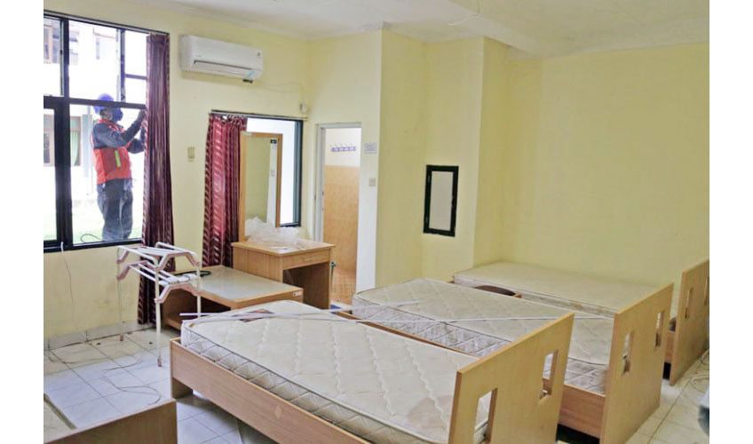 RS DARURAT— Pekerja menyelesaikan kesiapan RS Darurat Covid-19 di Kompleks Asrama Haji Pondok Gede, Jakarta.
