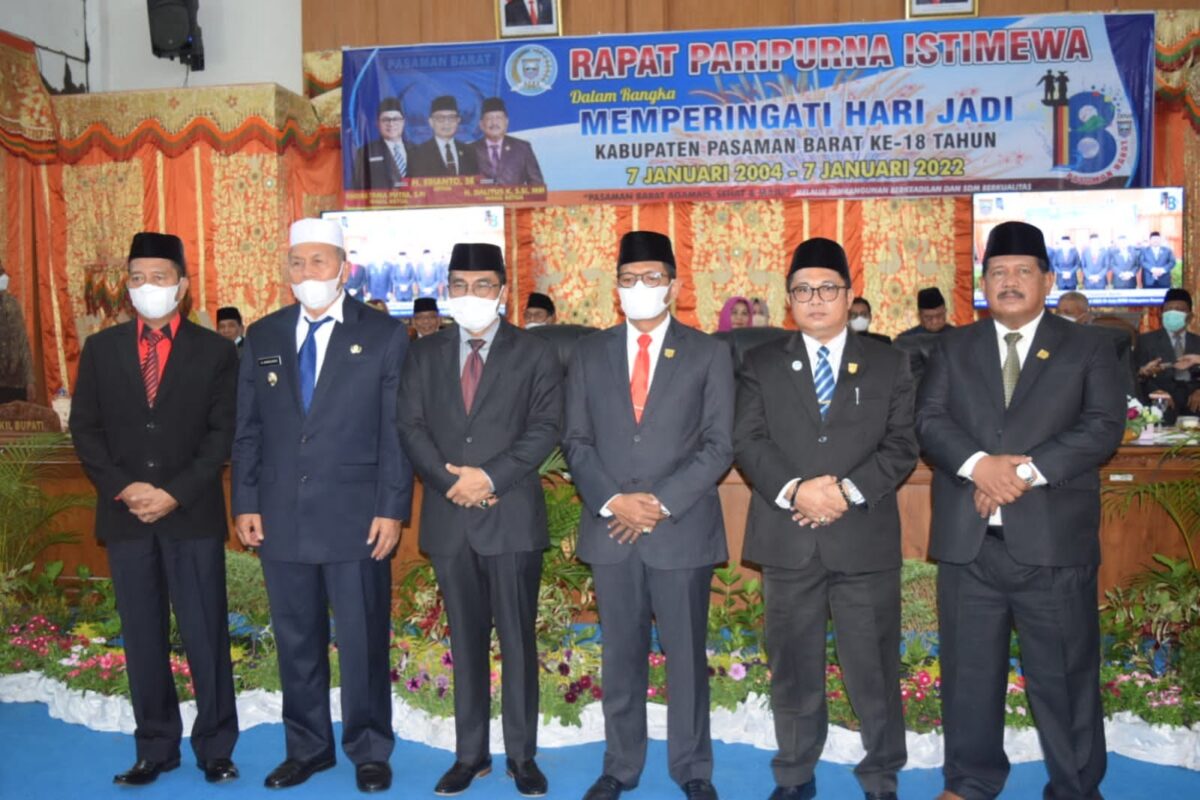 JUMAT, 7 Januari 2022 Kabupaten Pasaman Barat (Pasbar), genap berusia 18 tahun. Peringatan hari jadi Bumi Tuah Basamo itu diperingati dengan Rapat Paripurna Istimewa DPRD Pasbar yang dipimpin Ke­tua DPRD Erianto SE, di­dampingi Wakil Ketua Endra Yama Putra dan Dali­yus K. di aula kantor DPRD Pasbar, Jumat (7/1).