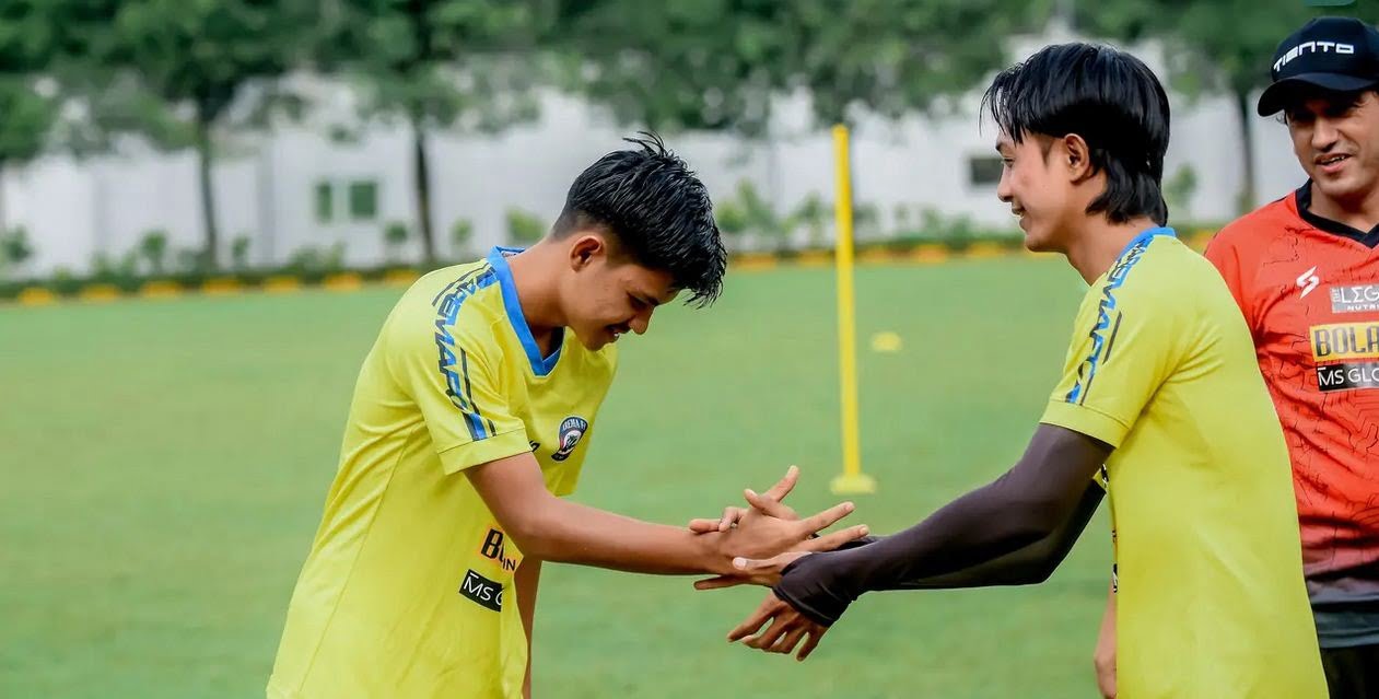 BERSALAMAN— Genta Alparedo saat bersalaman dengan kapten Arema FC, Ahmad Alfarizi, saat mengawali sesi latihan Singo Edan di Stadion Universitas Muhammadiyah Malang (UMM).