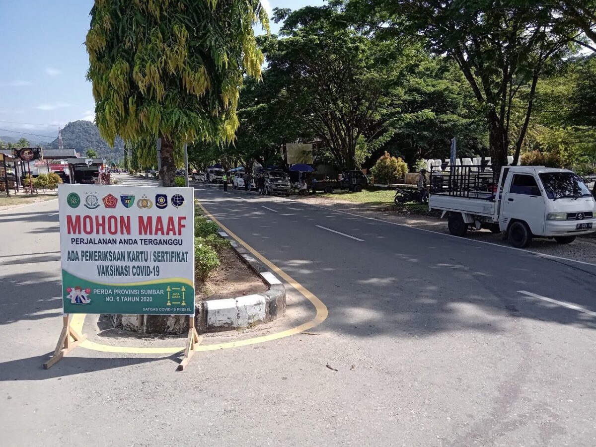 PESSEL, METRO–Polres Pesisir Selatan menggelar razia di ruas jalan utama di Pincuran Boga Painan, Kecamatan IV Jurai, Kabupaten Pesisir Selatan, Kamis (13/1) pagi. Namun razia digelar tim gabungan Polres Pessel itu bukan razia lalu lintas biasa. Polisi terlihat menghentikan sejumlah pengendara sepeda motor dan meminta mereka menunjukkan bukti telah divaksin. “Selamat pagi pak. Mohon maaf mengganggu perjalanannya. Maaf Bapak sudah divaksin apa belum? Tolong tunjukkan sertifikat vaksinnya,” ujar seorang polisi wanita kepada seorang pria pengendara sepeda motor.
